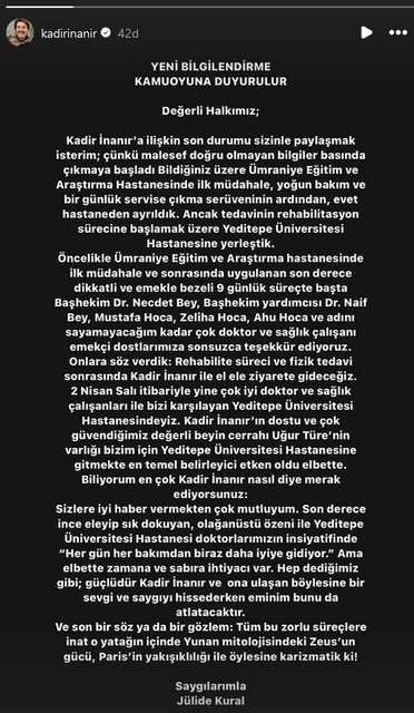 Kadir İnanır'ın hayat arkadaşı Jülide Kural, İnanır'ın tedavi sürecinin başka bir hastanede süreceğini söyleyerek; "Her gün biraz daha iyiye gidiyor ama elbette zamana ve sabıra ihtiyacı var. Hep dediğimiz gibi; güçlüdür Kadir İnanır ve ona ulaşan böylesine bir sevgi ve saygıyı hissederken eminim bunu da atlatacaktır" dedi.