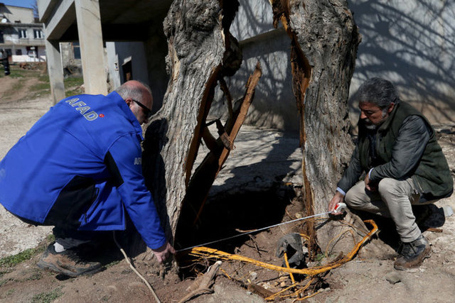 Kahramanmaraş merkezli ilk depremin merkez üssü Pazarcık ilçesinde fayın yüzey kırıklarını inceleyerek üç boyutlu modelleme çıkarmak üzere bölgede bulunan Dokuz Eylül Üniversitesi (DEÜ) Deprem Araştırma ve Uygulama Merkezi Müdürü Prof. Dr. Hasan Sözbilir, deprem sırasında ikiye ayrılan ağaç ve çevresinde de inceleme yaptı.