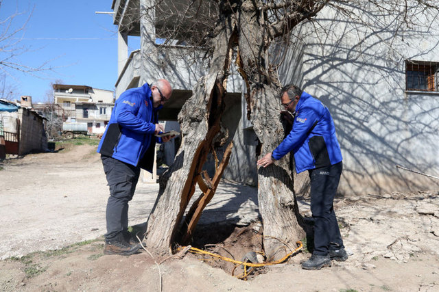 Deprem sonrası evleri incelerken dut ağacını gördüklerini ve şaşırdıklarını anlatan Balım, gövdesi dikine ikiye ayrılan ağaçtaki yarığın genişliğinin 1 metreye ulaştığını dile getirdi.