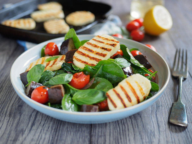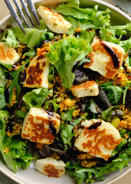 Üzerine hafifçe limon suyu, zeytinyağı, tuz ve karabiber ekleyin, karıştırın. Servis tabağına salatayı alın ve üzerine kızarmış hellim peynirini yerleştirin. Dilerseniz üzerine biraz daha limon suyu ve zeytinyağı gezdirebilirsiniz. Afiyet olsun!