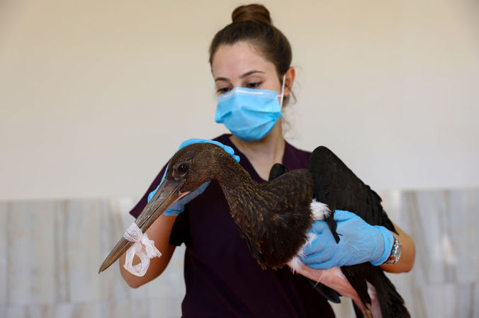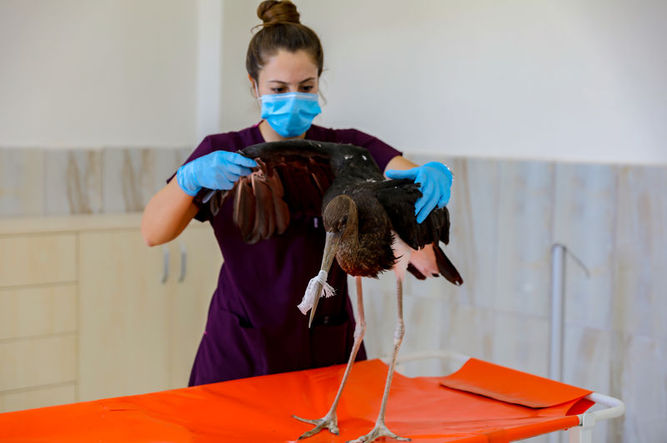 Burada, yenilenmesi için kesilen tüyleri çekilen kara leyleğin bakımı ve beslenmesi uzman ekiplerce yapılıyor.