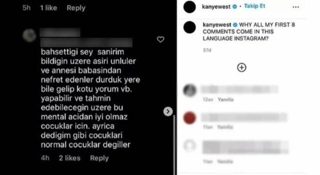 Paylaşımın altındaki tartışmalar devam ederken Kanye West, daha sonra "Neden tüm yorumlarımın ilk 8 tanesi bu dilde Instagram?" açıklamasıyla Türk takipçilerinin yorumlarının fotoğraflarını yayınladı.