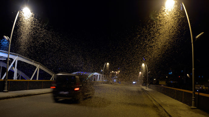 Dünyaya geldikten hemen sonra aydınlatma lambalarının etrafında toplanıp çiftleşen kelebeklerden erkek olanları, buradaki ölüm uçuşuyla kısa ömürlerine veda ediyor.