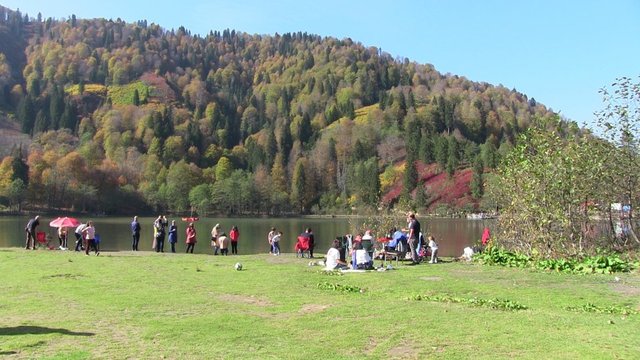 Ziyaretçiler yürüyüş ve piknik yapıyor, teknelerle gölün keyfini sürüyor.