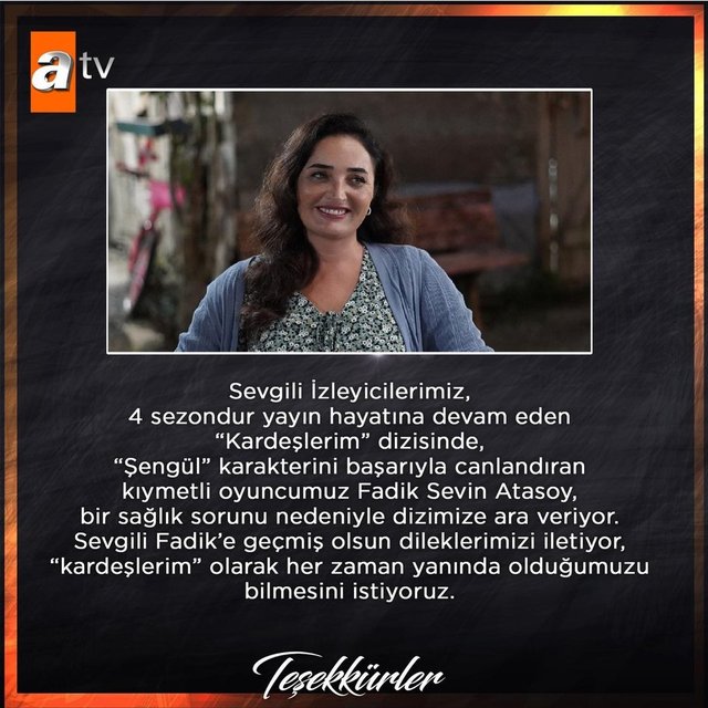 ATV'nin resmi sosyal medya hesabından "Sevgili İzleyicilerimiz, 4 sezondur yayın hayatına devam eden “Kardeşlerim” dizisinde, “Şengül” karakterini başarıyla canlandıran kıymetli oyuncumuz Fadik Sevin Atasoy, bir sağlık sorunu nedeniyle dizimize ara veriyor.