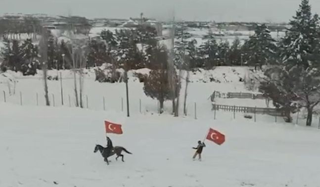 Atların arkasına bağlanan ipleri tutan gençler, ellerinde Türk bayraklarıyla snowboard yaptı.