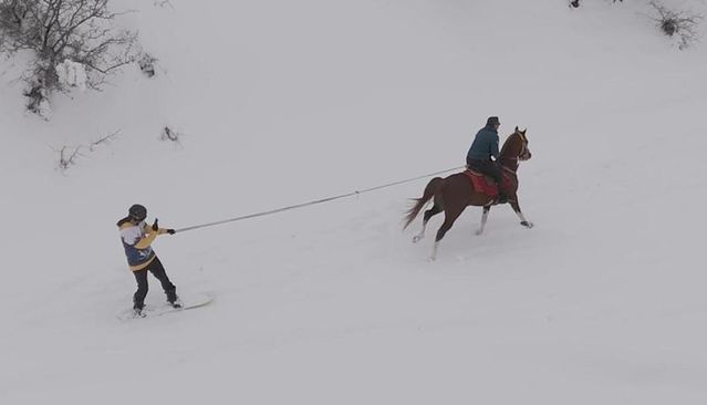 Erzincan'da snowboard tutkunları, karlı arazide safarinin ardından atların arkasına bağladıkları iplerle snowboard yaptı. Doğa, spor ve macerayı bir araya getiren etkinlik, ortaya çıkan görüntülerle ilgi gördü