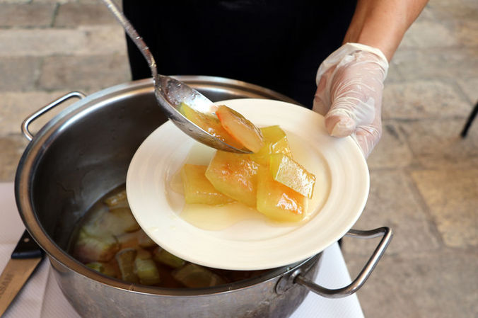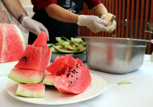 Hatay Gastronomi Evi'ndeki aşçılar tarafından israfın önlenmesi için uygulanan "Mutfakta Sıfır Atık Projesi" kapsamında, yaz meyvesi olarak tüketilen karpuzun kabukları artık çöpe gitmiyor.