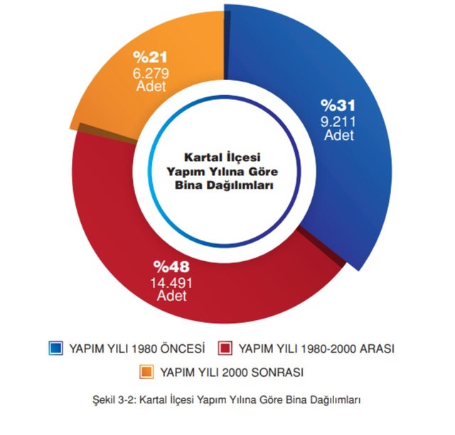 Kaçak yapılaşmadan dolayı veri yokluğu, geçmişte bina kayıtlarının bilgisayar tabanlı olarak tutulmamış olması ve mevcut verideki hata ve eksiklerden kaynaklı bina verisine ait yapım yılı bilgisine erişmekte önemli zorluklarla karşılaşılmıştır. Binaların yaşları, hangi deprem yönetmeliğine göre inşa edildiklerinin anlaşılması açısından büyük önem taşımaktadır. Kartal ilçesi bina envanteri, grafik olarak Şekil 3-2, 3-3, 3-4’te; harita olarak ise Şekil 3-5, 3-6, 3-7 ve 3-8’de gösterilmiştir.