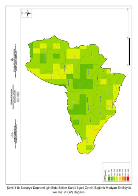 Deprem kayıp tahminlerinde, farklı bina ve altyapı unsurları için kullanılan hasar tahmin yöntemleri farklı yer hareketi parametrelerine bağlı olabilmektedir. İstanbul İli Olası Deprem Kayıp Tahminlerinin Güncellenmesi Projesi (2019) kapsamında bina ve altyapı unsurları için kullanılan hasar tahmin yöntemlerinde yer hareketi parametresi olarak En Büyük Yer İvmesi (PGA), En Büyük Yer Hızı (PGV) ve 0.2 ve 1.0 sn’deki Spektral İvme’ler kullanılmaktadır. Elde edilen dağılımlardan Kartal ilçesine ait En Büyük Yer İvmesi (PGA), En Büyük Yer Hızı (PGV) Parametreleri ve 0.2 ve 1.0 sn’deki Spektral İvme Haritaları, Şekil 4-4, Şekil 4-5, Şekil 4-6 ve Şekil 4-7’de sunulmaktadır.