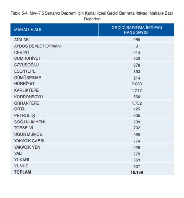 Deprem nedeni ile meydana gelen bina hasarlarının önemli bir etkisi de binaların barındırma özelliğini kaybetmesidir. Acil barınma ihtiyacının belirlenerek, bunun karşılanması için gerekli ön planlama ve çalışmaların yapılması, özellikle yoğun yapılaşmaya maruz metropol alanlarda beklenen depremler için kritik önemdedir. Deprem sonrası insanların, hasarlı olmasa da binalara girmeyip bir süre dışarda olmayı tercih etmeleri de genel resmi ağırlaştıran bir durumdur. Kartal’da Mw=7.5 senaryo depremi sonrasında yaklaşık 18.189 hanelik acil barınma ihtiyacının ortaya çıkacağı tahmin edilebilir. Hane başına 3 kişilik nüfus kabulüyle, yaklaşık 54.567 kişinin acil barınma ihtiyacı olacağı beklenmektedir. Bu tahminlerde de depremin oluş şekline göre, hasarlarda gördüğümüze benzer belirsizlikler bulunmakta olup, deprem sonrası gerçekleşen acil barınma ihtiyacı içindeki nüfus verilen değerin altında ya da üstünde gerçekleşebilir.