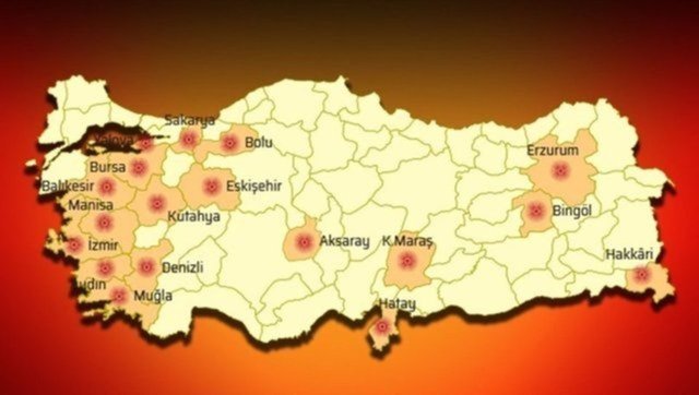 Eskişehir, Antalya, Tekirdağ, Edirne, Sinop, İstanbul, Kastamonu'yu, Ordu, Samsun, Giresun, Artvin, Şanlıurfa, Mardin, Kilis, Adana, Gaziantep'in de bazı bölgeleri ve Kahramanmaraş, Sivas, Gümüşhane, Bayburt, Kayseri, Yozgat, Çorum, Ankara, Konya, Mersin ve Nevşehir.