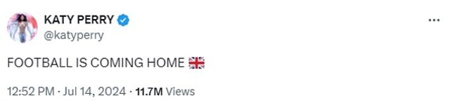 Şarkıcı, Almanya'nın başkenti Berlin'de oynanan, İspanya'nın 2-1'lik galibiyetiyle sonuçlanan final maçı öncesinde, X platformunda; "Futbol eve dönüyor" mesajına Birleşik Krallık bayrağı emojisi koydu.