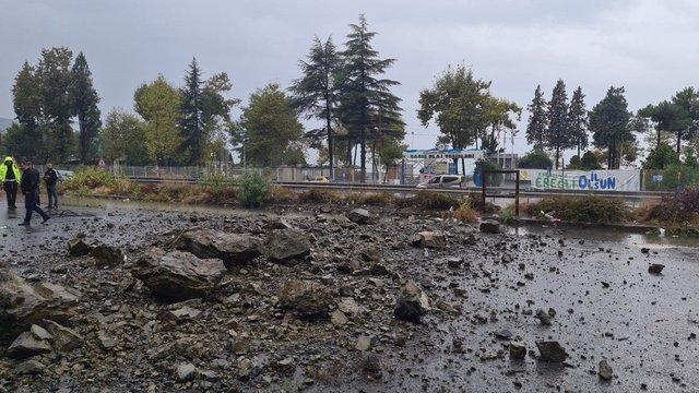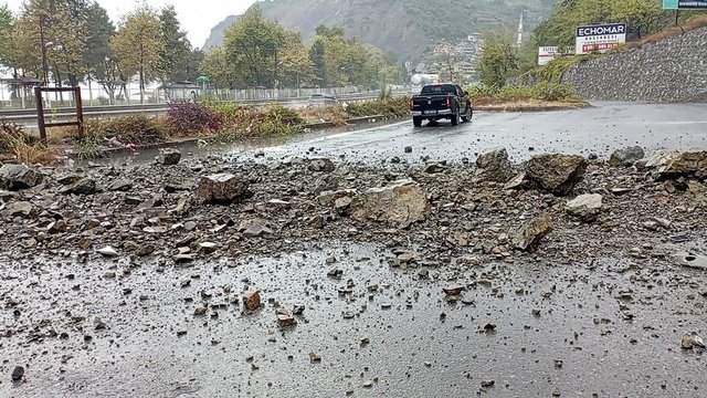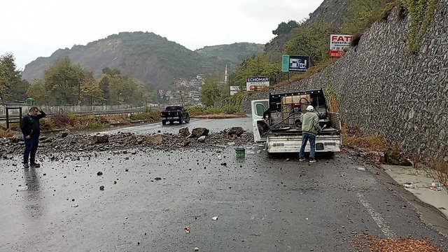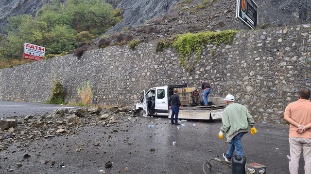 Zonguldak'ta faciadan dönüldü. Kentte yamaçtan düşen kaya parçaları bir kamyonete isabet etti. Sürücü, aracı geri almasıyla olaydan yara almaktan kıl payı kurtuldu