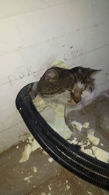 Kayseri Organize Sanayi Bölgesinde (OSB) inşaat halindeki bir fabrikada, fare kovaladığı sırada kafasını duvardaki deliğe sıkıştıran kediyi gören işçiler durumu itfaiyeye bildirdi.