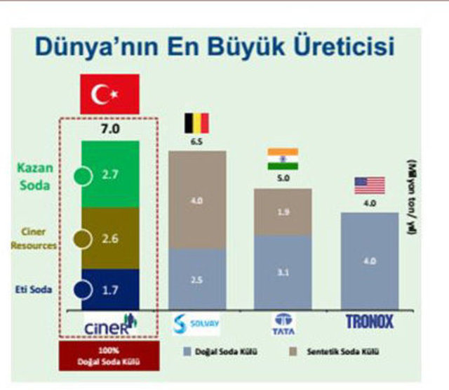 - Dünya talebinin yüzde 33’ü doğal soda külünden, yüzde 67’si sentetik suda külünden karşılanıyor. Türkiye doğal soda külünde de, sentetik dahil olmak üzere toplam soda külünde de dünyanın en büyük üreticisi haline geldi. 2.7 milyon tonluk Kazan Soda yanında Beypazarı’nda Eti Soda 1.8 milyon ton üretim yapıyor. ABD’de satın alınan soda külü üreticisi Ciner Resources’ün üretimi de 2.5 milyon ton. Böylece Ciner Grubu 7 milyon tonluk üretimle dünyanın en büyük soda külü üreticisi haline geldi. Ciner Grup’u 6.5 milyon tonla Alman Solvay ve 5 milyon tonla Hindistanlı Tata izliyor.