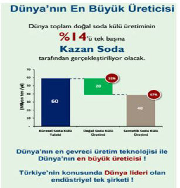 Bu zamana kadar ise dünyada soda iki kaynaktan temin ediliyordu. Amerika doğal kaynaklardan soda külü üretirken, Avrupa ise sentetik olarak geliştirip, üretiyordu. Aynı zamanda Türkiye Şişe Cam da sentetik kaynaklardan soda külü üreten ve tüketen bir şirketti. Ama önce “Eti Soda” ve ardından dün açılışı yapılan “Kazan Soda” ile pahalı sentetik soda külü defteri Türkiye’de kapanmış oldu.