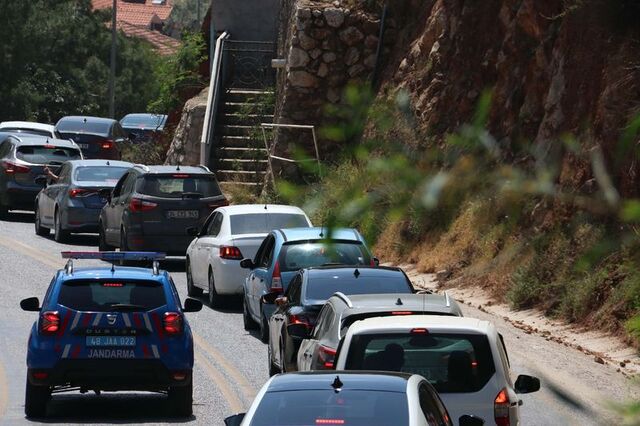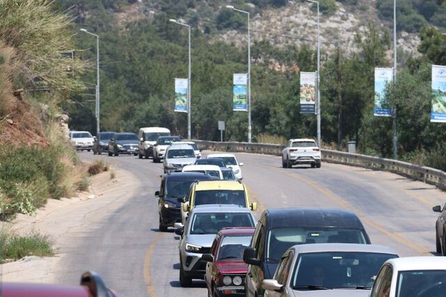 Muğla'nın turistik Fethiye ilçesinde Kelebekler Vadisi'ni gören seyir alanında fotoğraf çektirmek isteyenler tatilciler, Ölüdeniz yolunda uzun araç kuyrukları oluşturdu. Havadan görüntülenen yolda araçların ilerlemekte güçlük çektiği görüldü