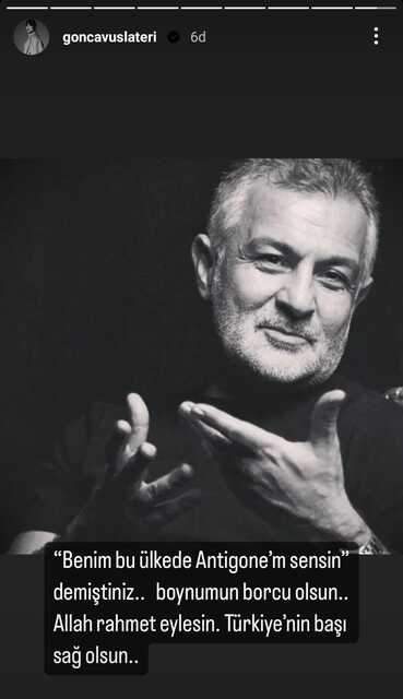 Gonca Vuslateri: Benim bu ülkede Antigone'm sensin demiştiniz. Boynumun borcu olsun... Allah rahmet eylesin. Türkiye'nin başı sağ olsun