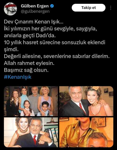 Gülben Ergen: Dev çınarım Kenan Işık... İki yılımızın her günü sevgiyle, saygıyla, anılarla geçti 'Dadı'da... 10 yıllık hasret sürecine sonsuzluk eklendi şimdi. Değerli ailesine, sevenlerine sabırlar dilerim. Allah rahmet eylesin. Başımız sağolsun.