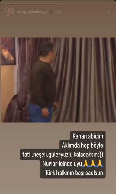 Nurgül Yeşilçay: Kenan abiciğim, aklım hep böyle; tatlı, neşeli, güler yüzlü kalacaksın. Nurlar içinde uyu. Türk halkının başı sağ olsun.