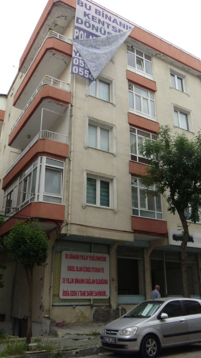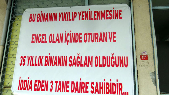 Bunun üzerine bina sakinleri, dükkanların bulunduğu bölüme "Bu binanın yıkılıp yenilenmesine engel olan içinde oturan ve 35 yıllık sağlam olduğunu iddia eden 3 daire sahibidir" yazılı pankart astı.