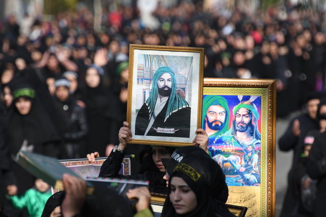 Siyah elbise giyen kadınlar, ellerinde dev zülfikar kılıcıyla yürüyüşe katıldı.