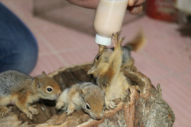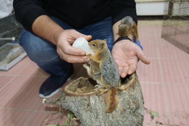 Adıyaman'ın Kahta ilçesinde bir hayvansever, ağacın kovuğunda bulunan 4 sincap yavrusunu biberonla besleyerek hayata tutunmalarını sağlıyor.