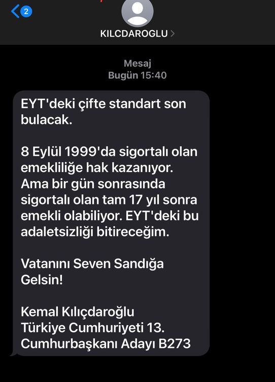 Cumhurbaşkanı Adayı ve CHP Genel Başkanı Kemal Kılıçdaroğlu, vatandaşlara gönderdiği SMS ile "Bir gün sonrasında sigortalı olan tam 17 yıl sonra emekli olabiliyor. EYT'deki bu adaletsizliği bitireceğim" vaadini dile getirdi