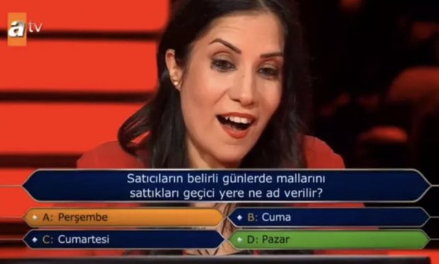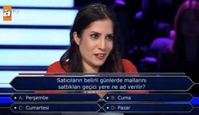 Daha sonra yarışmacının önüne ikinci soru olan, "Satıcıların belirli günlerde mallarını sattıkları geçici yere ne ad verilir?" sorusu geldi. Şıklarda, A: Perşembe, B: Cuma, C: Cumartesi ve D: Pazar yer alıyordu.