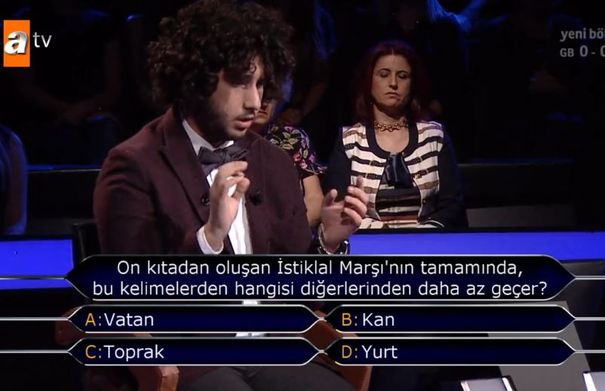 Kim Milyoner Olmak İster 5 Ekim 2019 tarihli yayınında Arda Ayten'in karşısına, "On kıtadan oluşan İstiklal Marşı'nın tamamında, bu kelimelerden hangisi diğerlerinden daha az geçer? soru çıktı. Şıklarda ise, Vatan, Kan, Toprak ve Yurt bulunuyordu. Arda Ayten, doğru cevap olan Toprak'ı söylerek milyonluk soruyu doğru bildi. Arda Ayten ve ailesi gözyaşlarına boğuldu. Kenan İmirzalıoğlu genç yarışmacıyı tebrik etti.