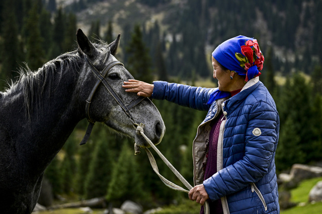 Kazakistan'ın Karakol bölgesinde yaşayan Okubaev ailesi, yazları Tanrı Dağları'nda büyükbaş hayvancılıkla uğraşmalarının yanı sıra at besiciliği yapıyor.