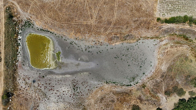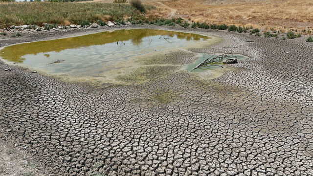 Bölgede etkili olan kuraklık ve aşırı sıcaklara bağlı olarak Kırklareli'nin Babaeski ilçesinin Müsellim köyündeki göletin su seviyesi düştü.