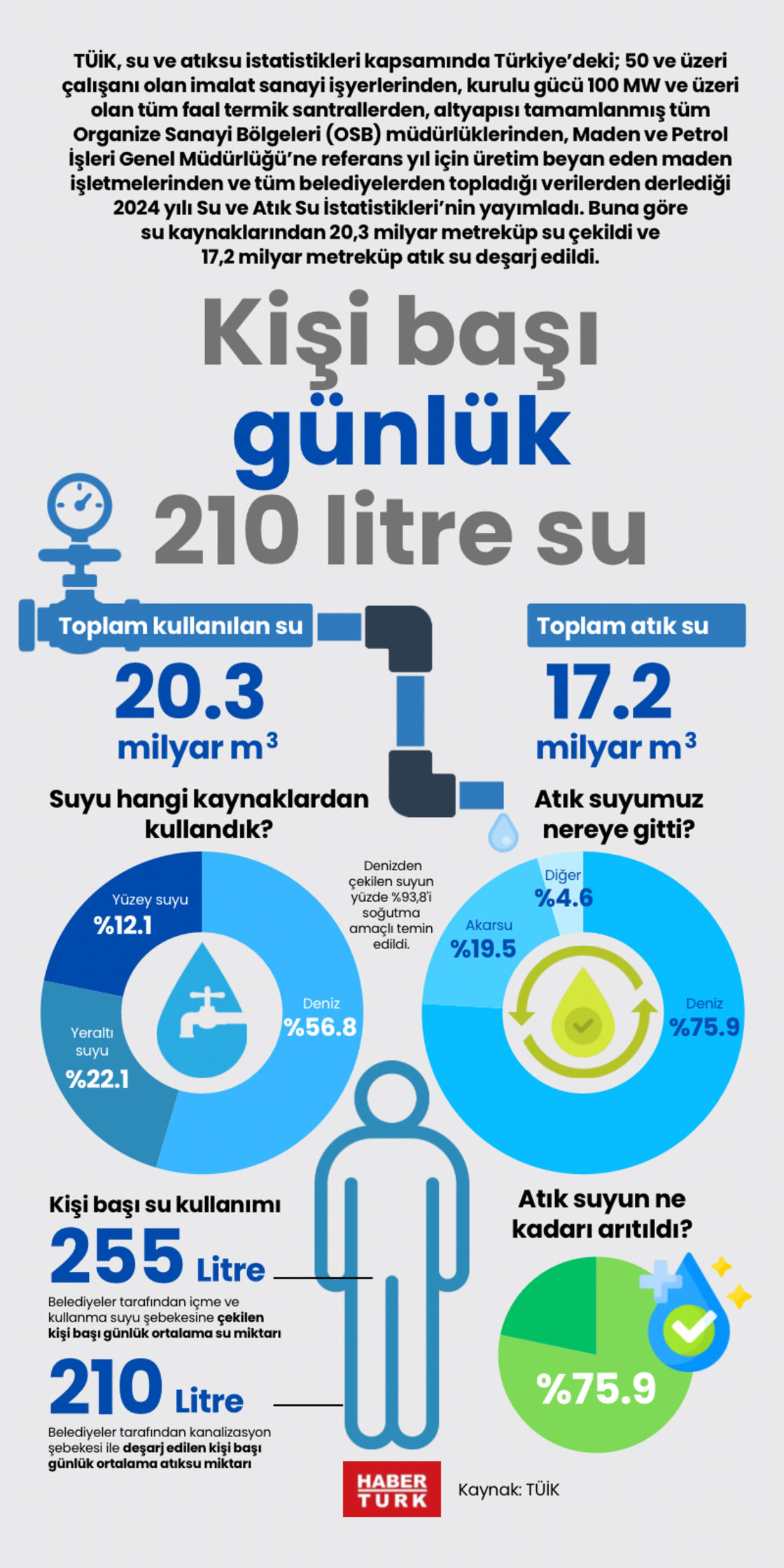 TÜİK, su ve atık su istatistikleri kapsamında Türkiye'deki; 50 ve üzeri çalışanı olan imalat sanayi işyerlerinden, kurulu gücü 100 MW ve üzeri olan tüm faal termik santrallerden, altyapısı tamamlanmış tüm Organize Sanayi Bölgeleri (OSB) müdürlüklerinden, Maden ve Petrol İşleri Genel Müdürlüğü'ne referans yıl için üretim beyan eden maden işletmelerinden ve tüm belediyelerden topladığı verilerden derlediği 2024 yılı Su ve Atık Su İstatistikleri'nin yayımladı. Buna göre su kaynaklarından 20,3 milyar metreküp su çekildi ve 17,2 milyar metreküp atık su deşarj edildi.