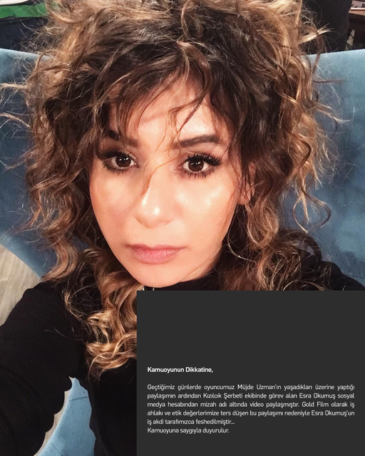 Yapım şirketi Gold Film, Esra Okumuş ile iş akdini sonlandırdıklarını duyurdu: Geçtiğimiz günlerde oyuncumuz Müjde Uzman'ın yaşadıkları üzerine yaptığı paylaşımın ardından 'Kızılcık Şerbeti' ekibinde görev alan Esra Okumuş, sosyal medya hesabından mizah adı altında video paylaşmıştır. Gold Film olarak iş ahlakı ve etik değerlerimize ters düşen bu paylaşımı nedeniyle Esra Okumuş'un iş akdi tarafımızca feshedilmişti. Kamuoyuna saygıyla duyurulur.