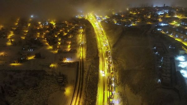 Kocaeli'de etkili olan kar yağışı sebebi ile TEM Otoyolu ulaşıma kapandı. Yaklaşık 1,5 saat kapalı kalan yolda araç sürücüleri, araçlarında yolun açılmasını bekledi. Karayolları ekipleri tarafından yapılan tuzlama çalışmaları ve makaslayan TIR'ların vinçler yardımı ile kaldırılmasının ardından yol tekrar trafiğe açıldı. Kilometrelerce uzunlukta araç kuyruğunun oluştuğu TEM Otoyolu havadan görüntülendi