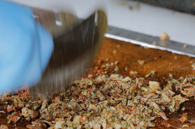 Bir ızgarada baharatları ve tuzu eklendikten sonra harmanlanarak kavrulur.