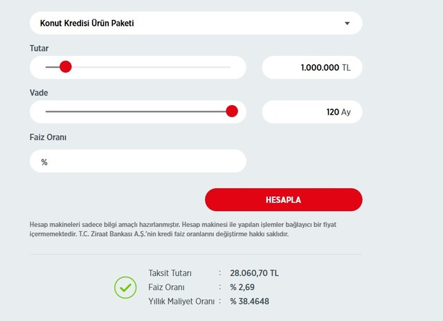 Ziraat Bankası, 1 milyon TL'lik konut kredisini, aylık %2,69 oran ve aylık 38 bin 46 TL taksitle veriyor.