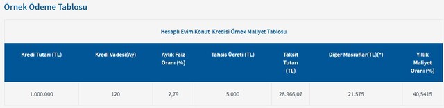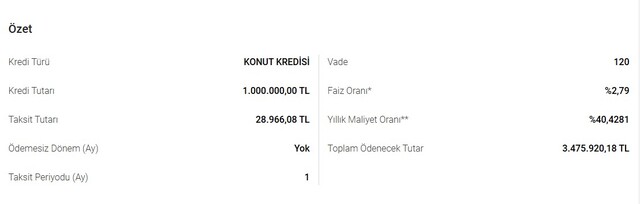 Vakıfbank, 1 milyon TL'lik konut kredisini, aylık %2,79 oran ve aylık 28.966,08 TL taksitle veriyor. Toplam geri ödeme miktarı ise 3.475.920,18 TL olarak yansıyor.