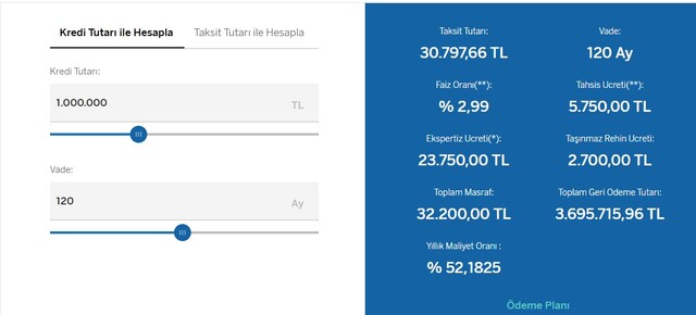 Garanti Bankası, 1 milyon TL'lik konut kredisini, aylık %2,99 oran ve aylık 30 bin 797 TL taksitle veriyor.