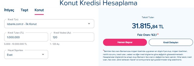 İş Bankası, 1 milyon TL'lik konut kredisini, aylık %3,10 oran ve aylık 31 bin 815 TL taksitle veriyor. Toplam geri ödeme miktarı ise 3 milyon 849 bin TL olarak yansıyor.