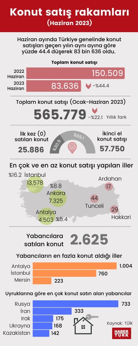 TÜİK haziran ayı konut satış rakamlarını açıkladı. Buna göre Türkiye genelinde konut satışları Haziran ayında bir önceki yılın aynı ayına göre yüzde 44.4 azalarak 83 bin 636 oldu. Bu, Temmuz 2021'den bu yana kaydedilen en sert yıllık düşüş oldu