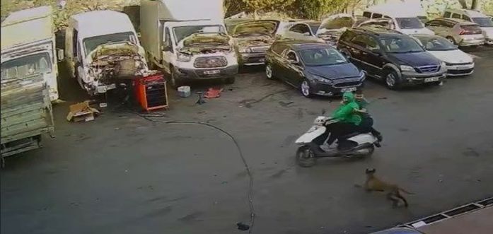 Sultangazi'de sanayi sitesi içerisinde ilerleyen motosikletli, üzerine doğru koşan köpekten kaçmaya çalışırken kamyonete çarptı. O anlar güvenlik kamerasına yansıdı.