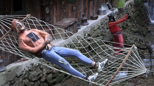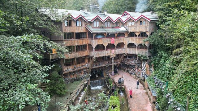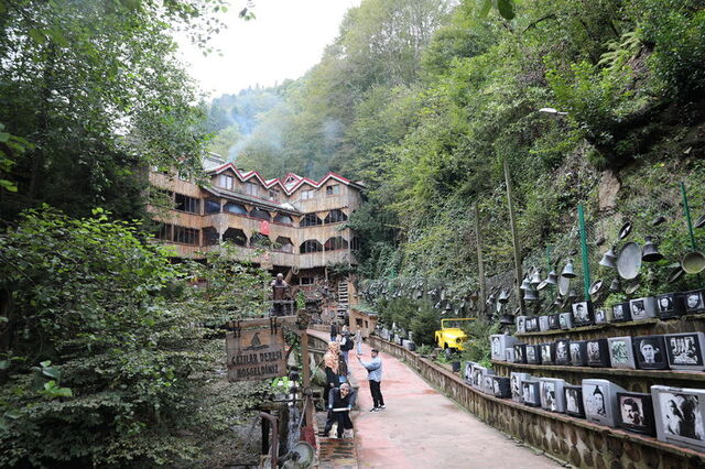 Trabzon'da dere kıyısında yer alan alabalık tesisi, her bir köşesine konulan ürpertici cadı figürleri ve plastik heykellerle korku filmlerini aratmıyor. Tesise gelen müşteri ve turistler, önce korkuyor sonra da gülümseyerek, yöresel lezzetlerden tadıyor