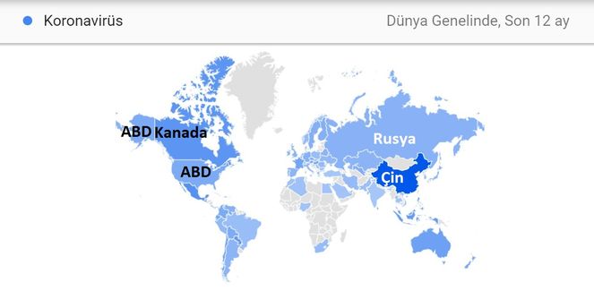 Google Trends raporuna göre dünya genelinde "Koronavirüs" konu başlığının ülkelere göre arama yoğunluğu şu şekilde: