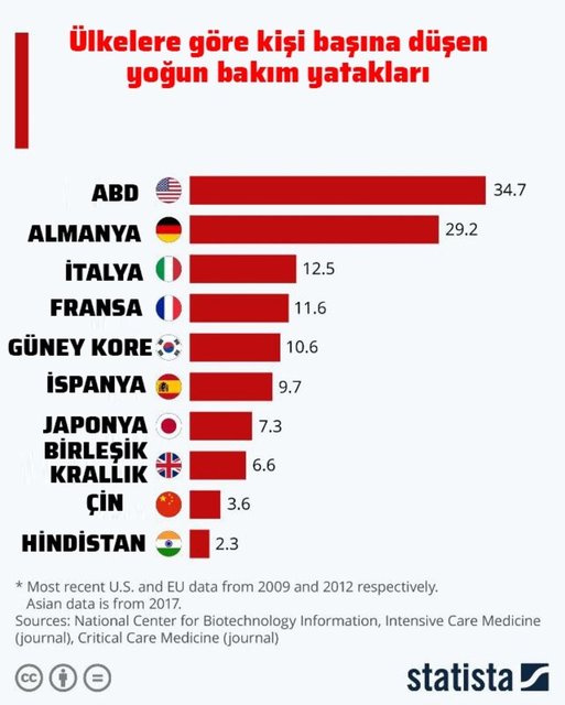 Almanya, Avrupa Birliği’nin en fazla yoğun bakım yatağına sahip ülkesi. Portekiz ise en az yoğun bakım yatağına sahip ülkesi. Yoğun bakım yataklarındaki oranlar hesaplanırken 100.000 kişiye düşen yatak sayısı oranları paylaşılıyor.