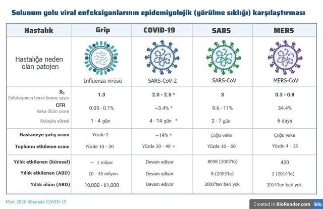 Hastalığa neden olan patojenlere bakıldığında işte grip, SARS ve MERS gibi solunum yolu viral enfeksiyonlarının epidemiyolojik karşılaştırması...