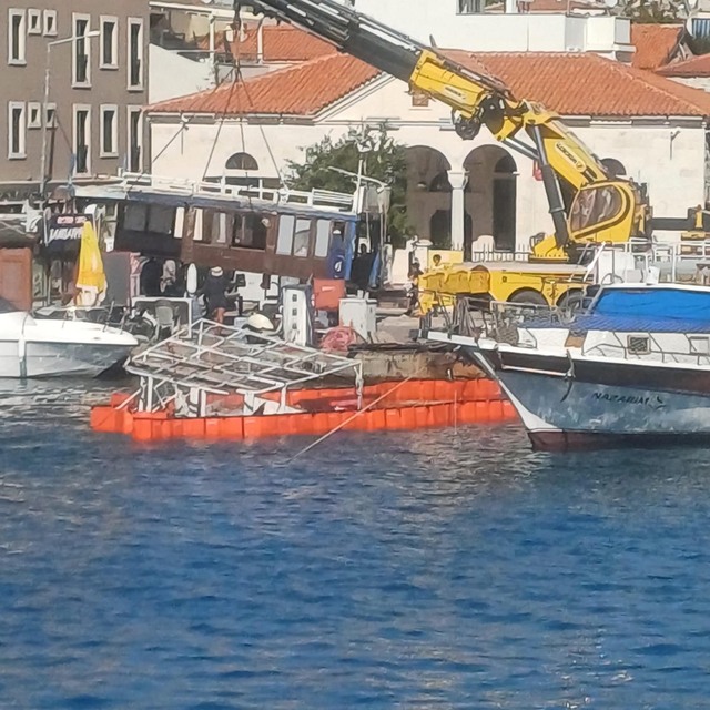 İzmir'deki limanda 8 yıldır bağlı duran 'Gülay' adlı gezi teknesi, yan yatıp suya gömüldü. Yaklaşık 50 yıllık teknenin bölgede "Korsan Mesut" olarak bilinen babasından yadigar olduğunu belirten Mert Fırat, "8 yıl önce tersanedeki bakımı sırasında zarar gördü. Tersaneye dava açtık. Limanda duruyordu. Su alıp, battı. Üzgünüz" dedi.