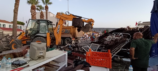 Tekne enkazı kamyona yüklenip bölgeden taşındı.