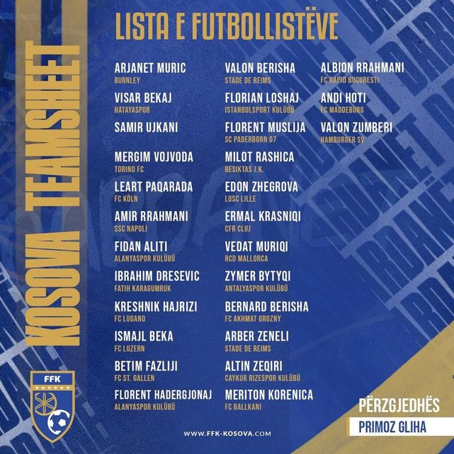 Kosova Milli Futbol Takımı’nın, 2024 Avrupa Şampiyonası Elemeleri’nde oynayacağı İsviçre ve Romanya maçlarının aday kadrosu belirlendi. Kadroda Süper Lig takımları Alanyaspor, Hatayspor, Fatih Karagümrük, Çaykur Rizespor, Beşiktaş, İstanbulspor ve Antalyaspor’dan toplam 8 futbolcu yer aldı.